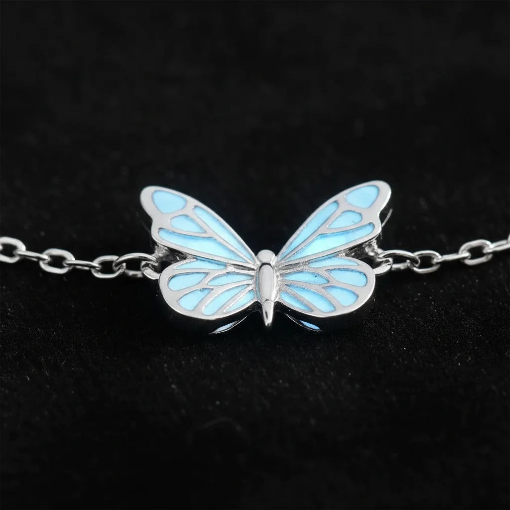 The enchanting radiance of our central butterfly is born from a special, delicate material that gently absorbs light, then releases a soft, ethereal blue glimmer. It's a subtle magic designed to captivate and add a unique sparkle to your every movement.