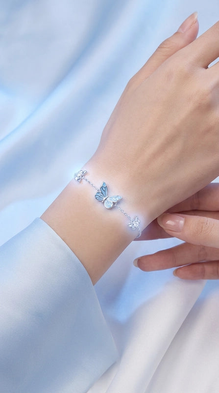 Flanking the central dream, two smaller butterfly charms flutter with their own subtle sparkle. They echo the main enchantment, adding layers of delicate shimmer, ensuring your wrist is adorned with a harmonious, luminous display.